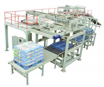 高位碼垛機可自動將包裝袋進行壓平、轉袋、分層編組;低位碼垛機采用PLC控制,通過觸摸屏進行垛層設計操作實現人機對話,可顯示生產速度故障原因及位置