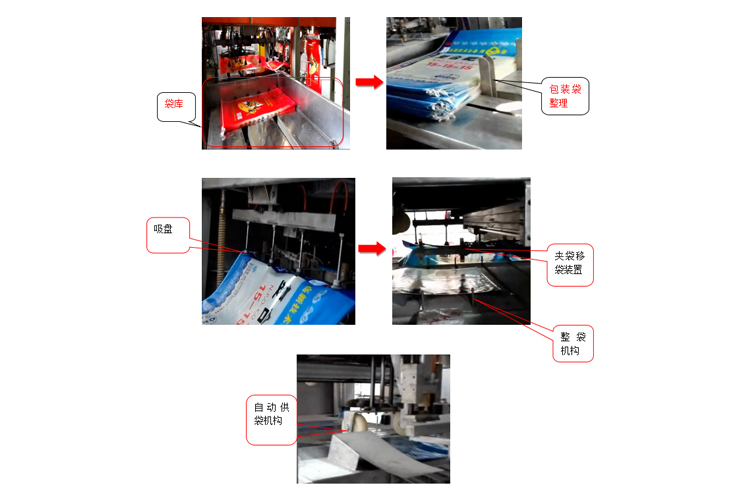 2.通過吸盤將包裝袋吸起,同時夾袋裝置將吸起的包裝袋移送到供袋整袋裝置,整袋裝置將包裝袋整袋調正。