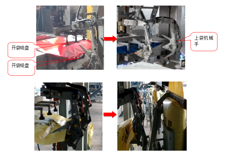 上袋裝置中開袋吸盤從包裝袋口上下兩個方向同時將包裝袋口吸開,上袋機械手伸入袋口內,將袋的上下兩面同時夾住,彎曲機械臂將包裝袋套到定量包裝秤下料口,過程結束。