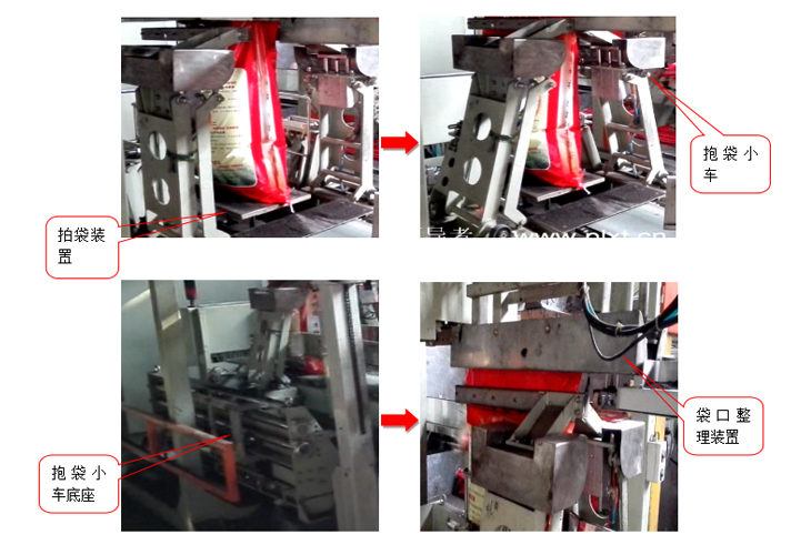 定量包裝機下料灌裝的過程中,底部的拍袋裝置啟動,確保袋內物料充填緊密。灌裝結束后拍打停止,下料口夾袋裝置打開,充填物料后的包裝袋在下料口放下的同時,由送包小車經專門加工的用于粉體、顆粒物料料袋的抱包、夾包裝置將料袋中部抱住,袋口夾住,送至活動導入裝置,活動導入與熱合縫包一體機系統(tǒng)相連.經其進入封口傳動鏈中,保證袋口成一字形。在導入器附近增加吸塵口,通過與除塵系統(tǒng)連接可吸走夾住袋口時飛出的粉塵.